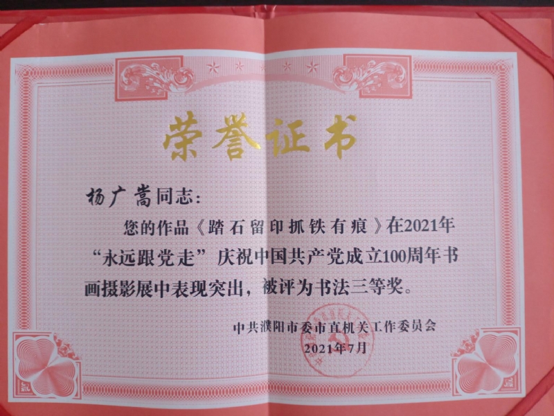經(jīng)過專家評(píng)委會(huì)的嚴(yán)格評(píng)選,集團(tuán)公司黨委委員、副總經(jīng)理?xiàng)顝V嵩的作品《踏石留印抓鐵有痕》榮獲書法三等獎(jiǎng);集團(tuán)公司榮獲優(yōu)秀組織獎(jiǎng)。