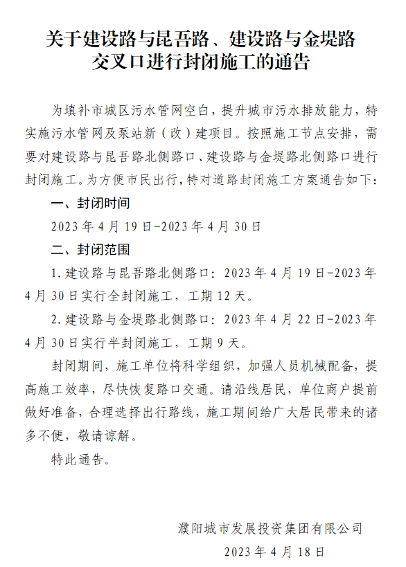 關(guān)于建設(shè)路與昆吾路、建設(shè)路與金堤路交叉口進(jìn)行封閉施工的通告