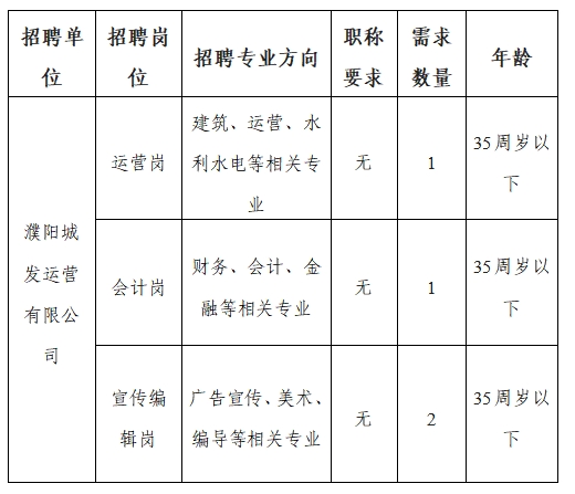 濮陽城發(fā)運(yùn)營有限公司人才招聘公告